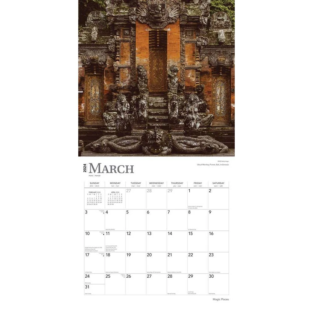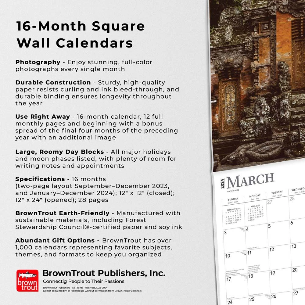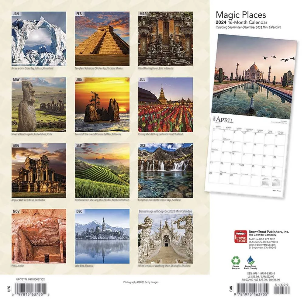 From Greece to Guatemala, from Egypt to Myanmar and beyond, this calendar travels the globe in search of power spots where sacred structures have enhanced human communion with other realms. Natural and manmade places that put forth extraordinary influence on mind and soul are the subjects of this magical calendar.