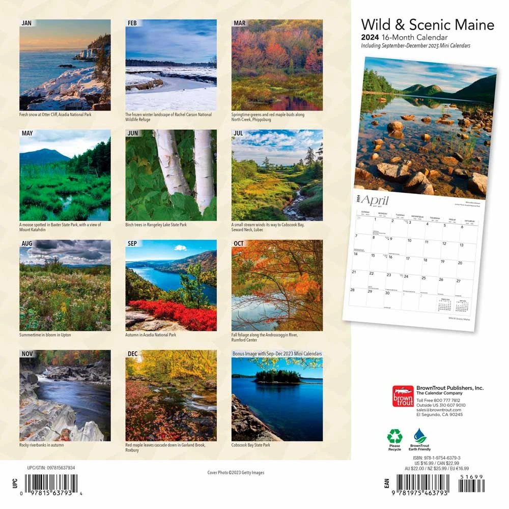 Spruce forests, rocky shores, beautiful beaches, and placid bays are all part of Maine’s stunning New England landscape. Then there are the mountains, marshes, and dazzling deciduous forests teeming with wildlife. In autumn, Maine transforms into a land of reds, yellows, and oranges; and the other seasons are just as spectacular. Celebrate wild and scenic Maine with this stunning calendar.