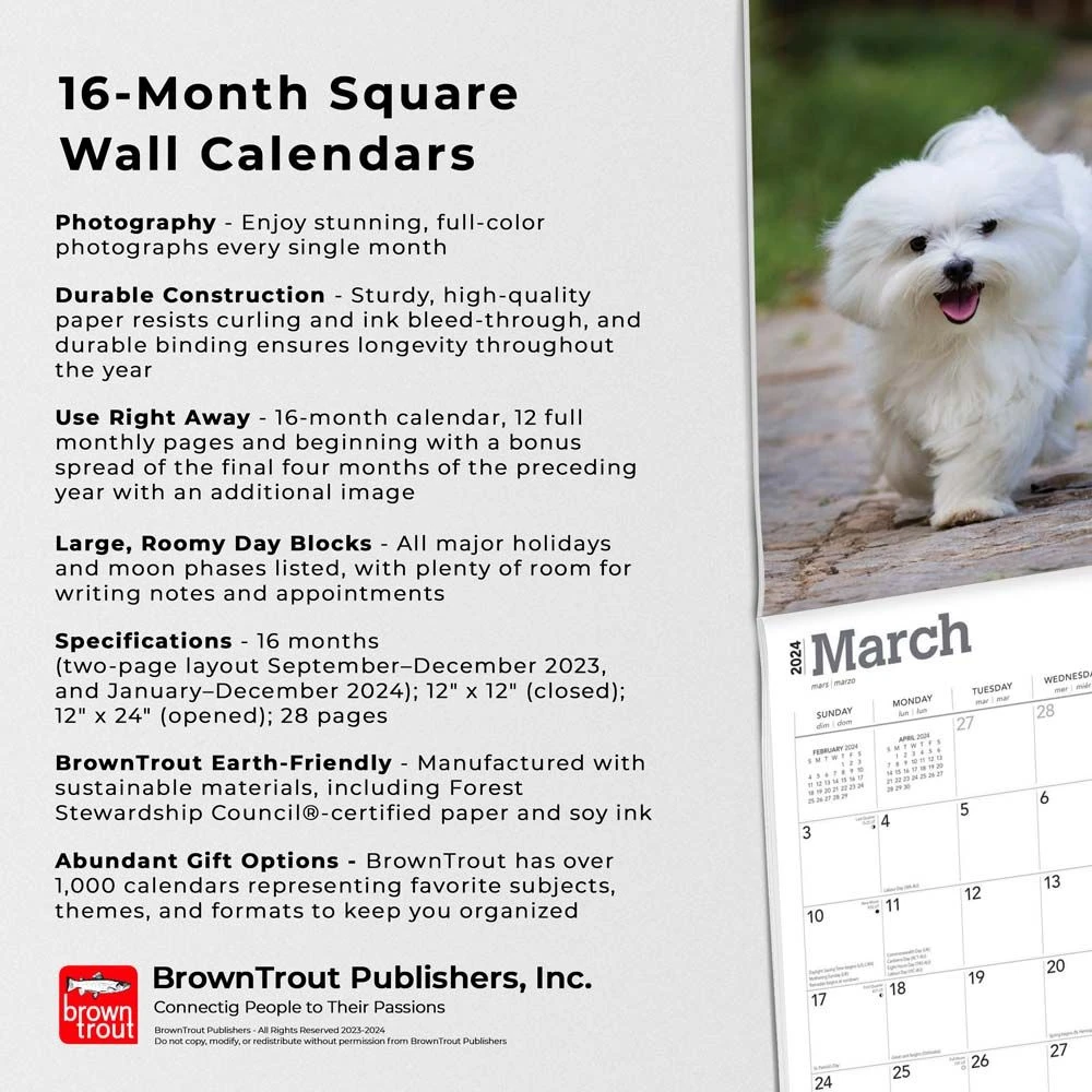 Though its precise origin is up for debate, the Maltese has strong, ancient ties to the Mediterranean, and it is certainly one of the oldest European dog breeds. This small dog has lots of character. It is known to be bold but very affectionate. And what a treat it is to pet that long, luxurious white hair! Enjoy colorful images of these charming little dogs in this Maltese calendar.