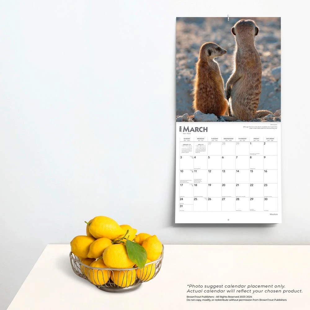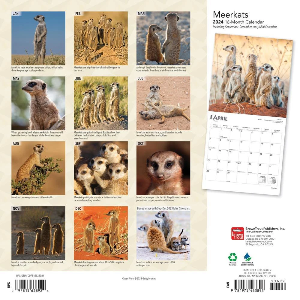 This member of the mongoose family resides in the Kalahari Desert of southern Africa. It is often considered to be a protector of villages. Meerkats are gregarious animals that work well together in foraging and protecting each other. This calendar is a window into the lives and natural environment of these little animals.