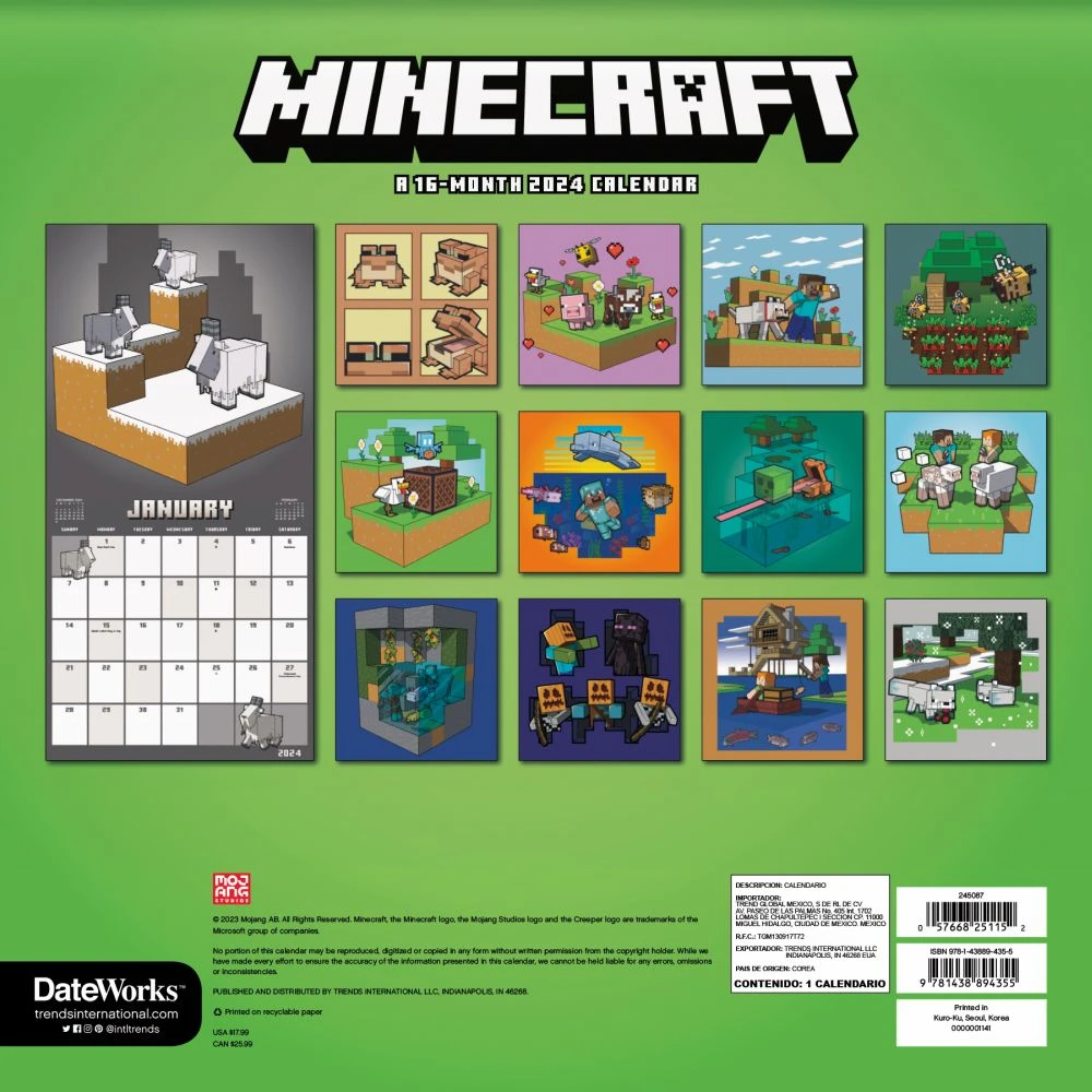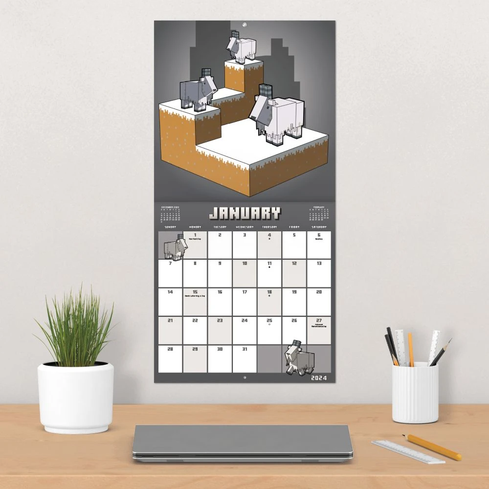 Take inventory of your bustling schedule this year as you create your own life within the world. Whether you decide to construct a brand new schedule or simply build onto your old one, you’ll find your creativity and passion for exploration within the pages of this 2024 Minecraft Calendar. DateWorks Wall Calendars feature a calendar page for each month of 2024, as well as the last four months of 2023. Each monthly calendar spread features enough room to mark important dates or write down reminder notes making them perfect for staying organized and productive all year long. 2023 2024 Calendars make a great gift for anyone on your list!