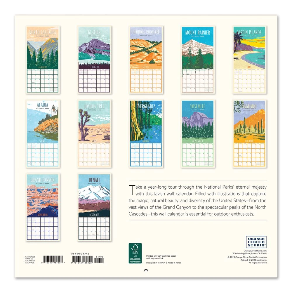 The stunning 12″ X 12″ decorative wall calendars from Orange Circle Studio showcase modern illustrations and artistic designs and cover a wide range of popular topics. Each calendar spans 12 months (2024), includes four bonus months (September to December 2023), and is printed on FSC certified paper with soy based inks. These delightful, on trend calendars serve as both wall decor and date reference.