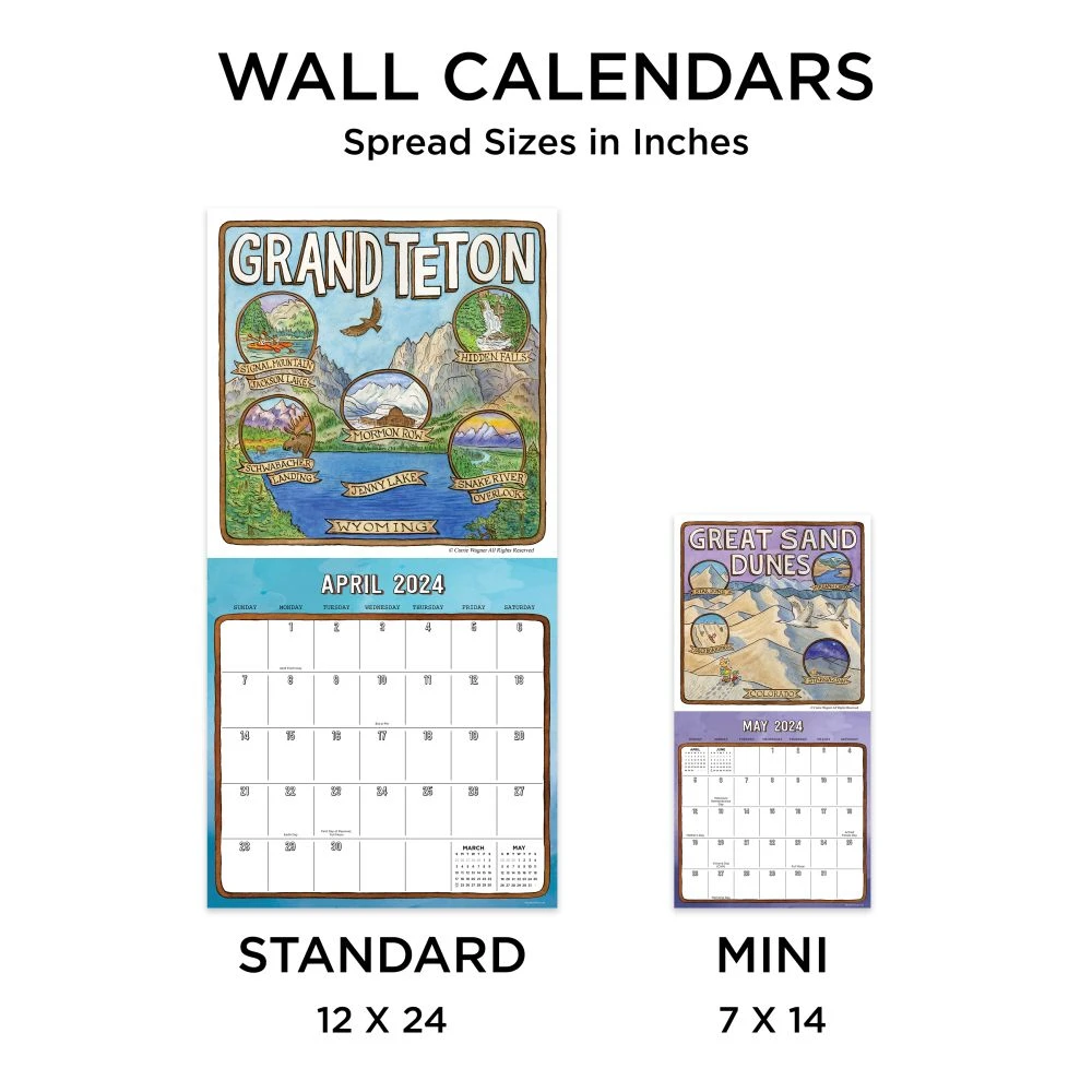 See the USA! Visit 12 of our National Parks through the eyes of artist Carrie Wagner. With colorful and whimsical artwork, our 2024 retro style calendar will take you back to simpler times and inspire you to plan your next adventure! Printed on premium matte paper, the 2024 calendar measures 12 x 12 and includes monthly calendar grids and full color images.