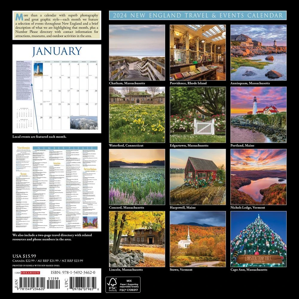 The New England Travel & Events Calendar includes stunning photography of areas all across New England from Vermont to Maine. Each month includes a Special Attractions column and a 2 page Number Please directory providing telephone numbers for local venues. Printed with soy based inks on FSC certified paper, this 12″ x 24″ wall calendar features large monthly grids that offer ample room for jotting notes, along with moon phases (CST), and standard U.S. and international holidays.