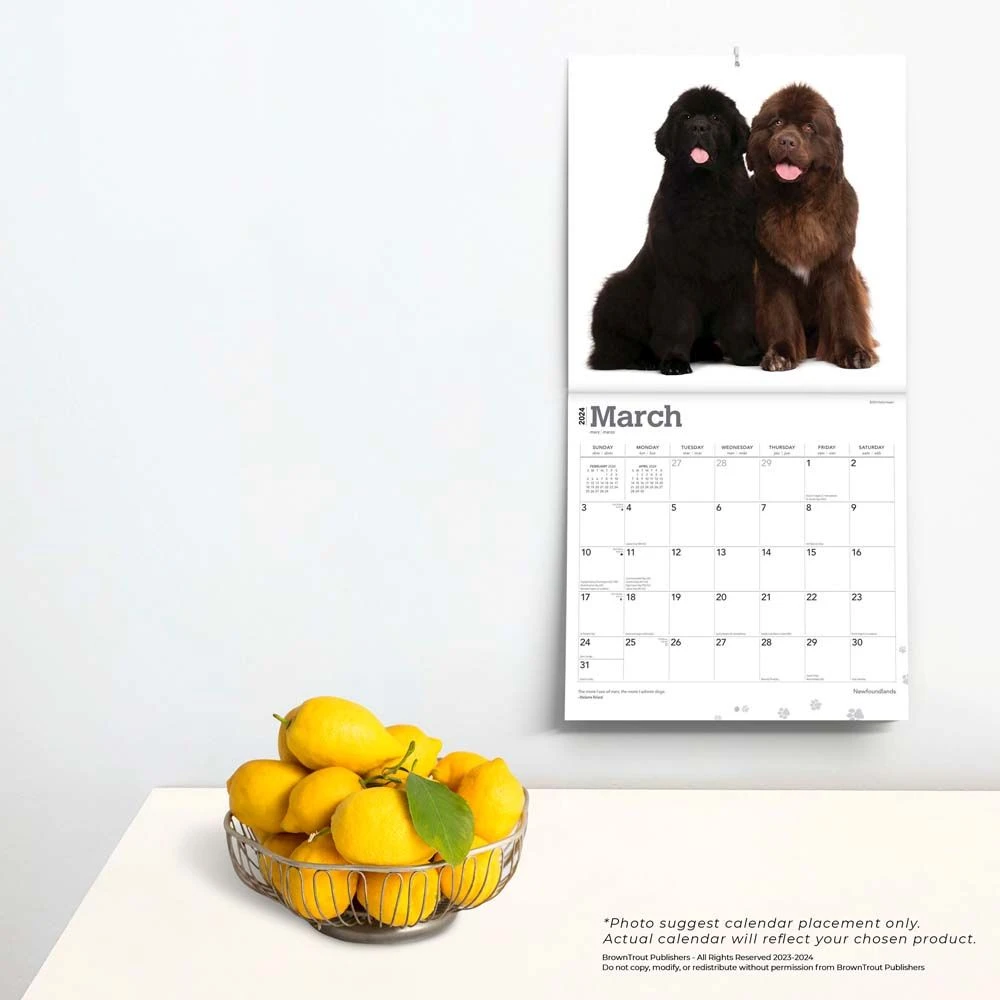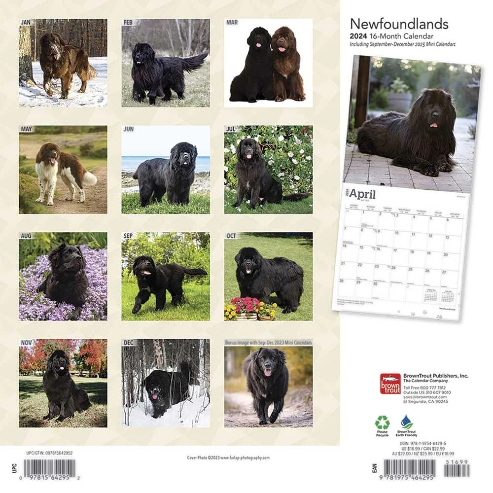 The imposing size of the Newfoundland belies its calm temperament. Dignified and gentle, these dogs thrive on human contact. Webbed feet, a water resistant coat, and a rudder like tail make Newfoundlands excellent swimmers. This colorful calendar honors the noble Newfoundland.