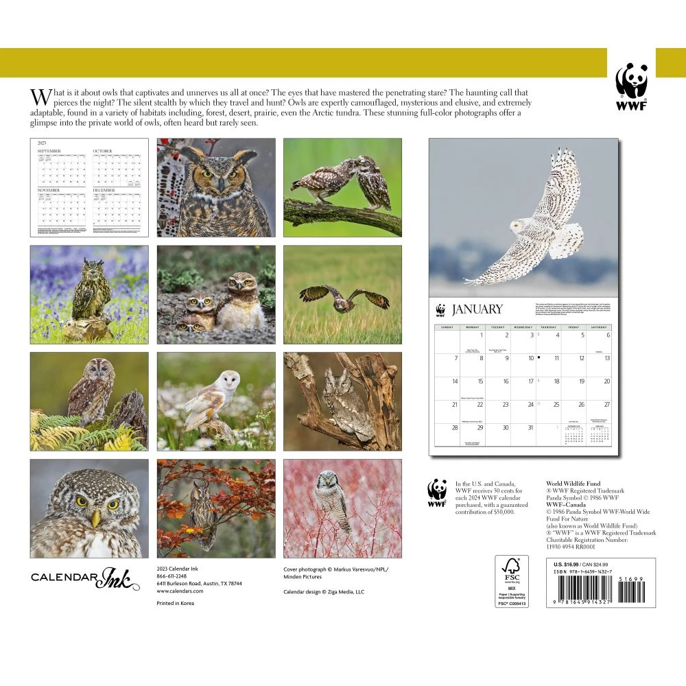 ?Let the 2024 Owls Wall Calendar showcase the beauty of these powerful nocturnal creatures all year long in your home, office, or kitchen. Witness these patient, powerful, and superbly camouflaged birds in flight and at rest in the most wooded forests to the coldest climates. In the US and Canada, WWF receives 50 cents for each WWF calendar purchased.