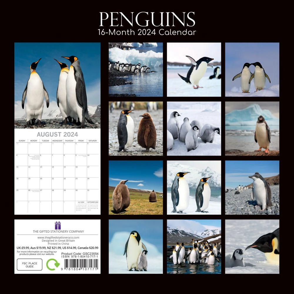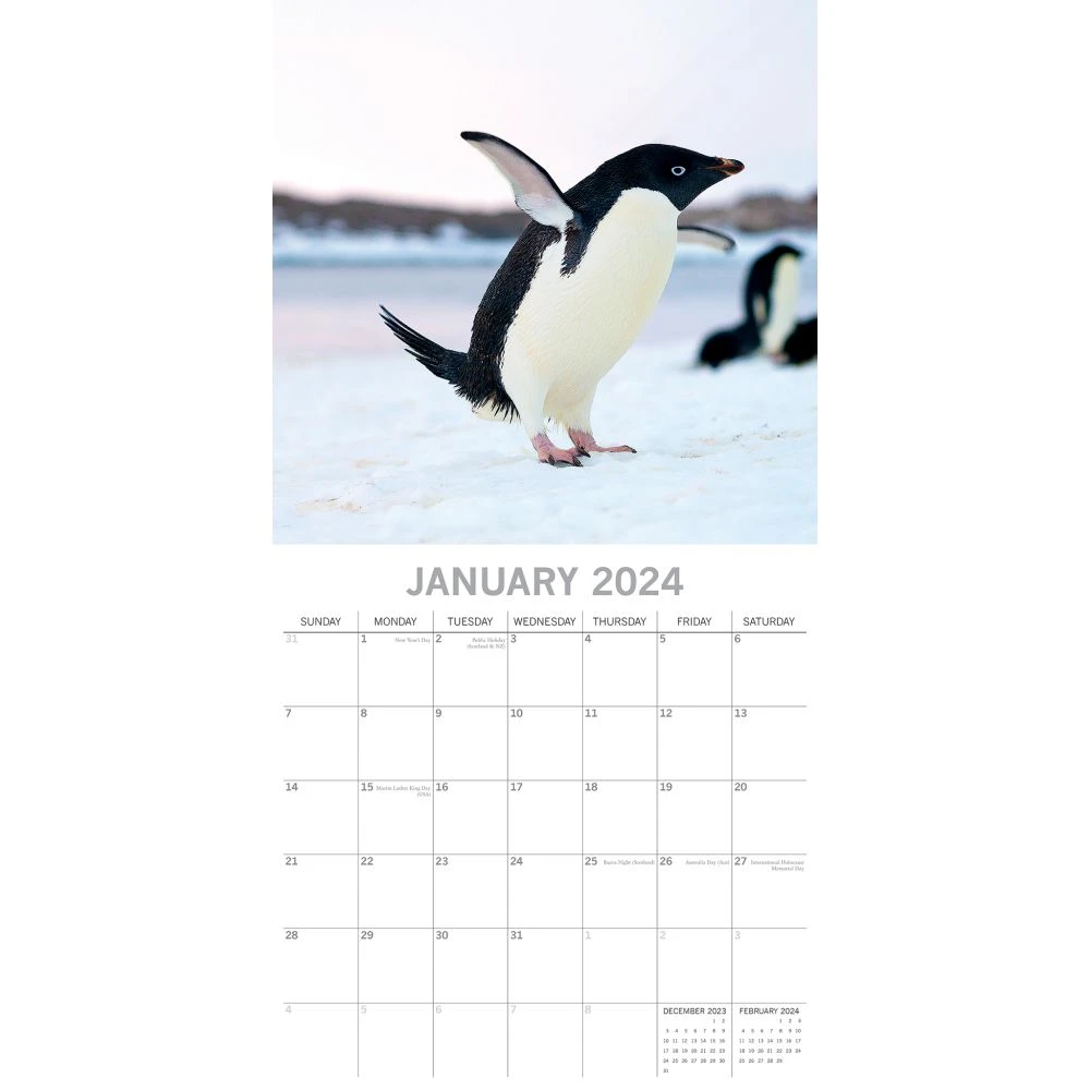 This lovely photographed 2024 calendar is perfect for Penguin lovers. This best seller features an array of beautiful images of cool penguins in their natural habitat, while the large grid is ideal for the home and office with space for birthdays and notes.