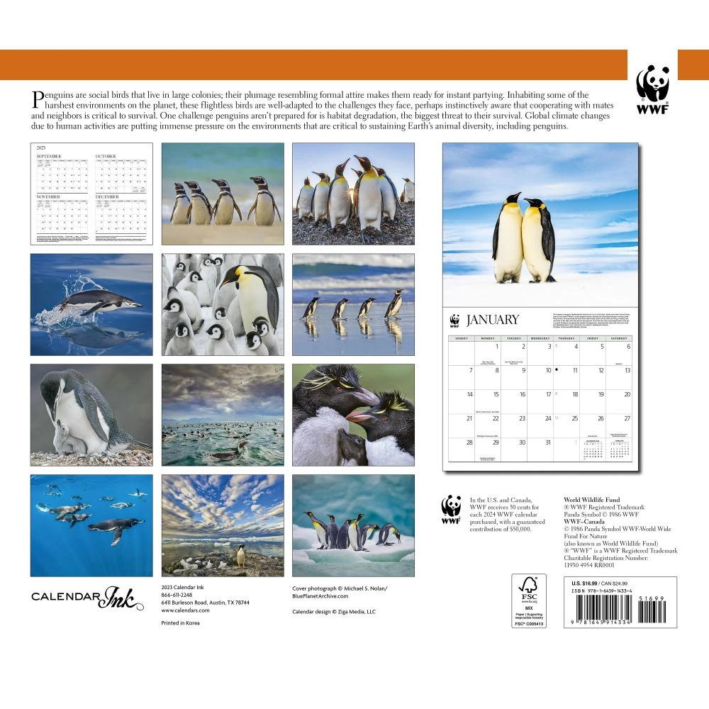 Penguins are easily the most dapper of the flightless birds. They show up everywhere in a tuxedo!! Even though there are just under 20 different species of penguins, each has its own unique characteristics that inspire awe in us all. The 2024 Penguins Wall Calendar allows you to bring the penguins frozen world into your home all year long.