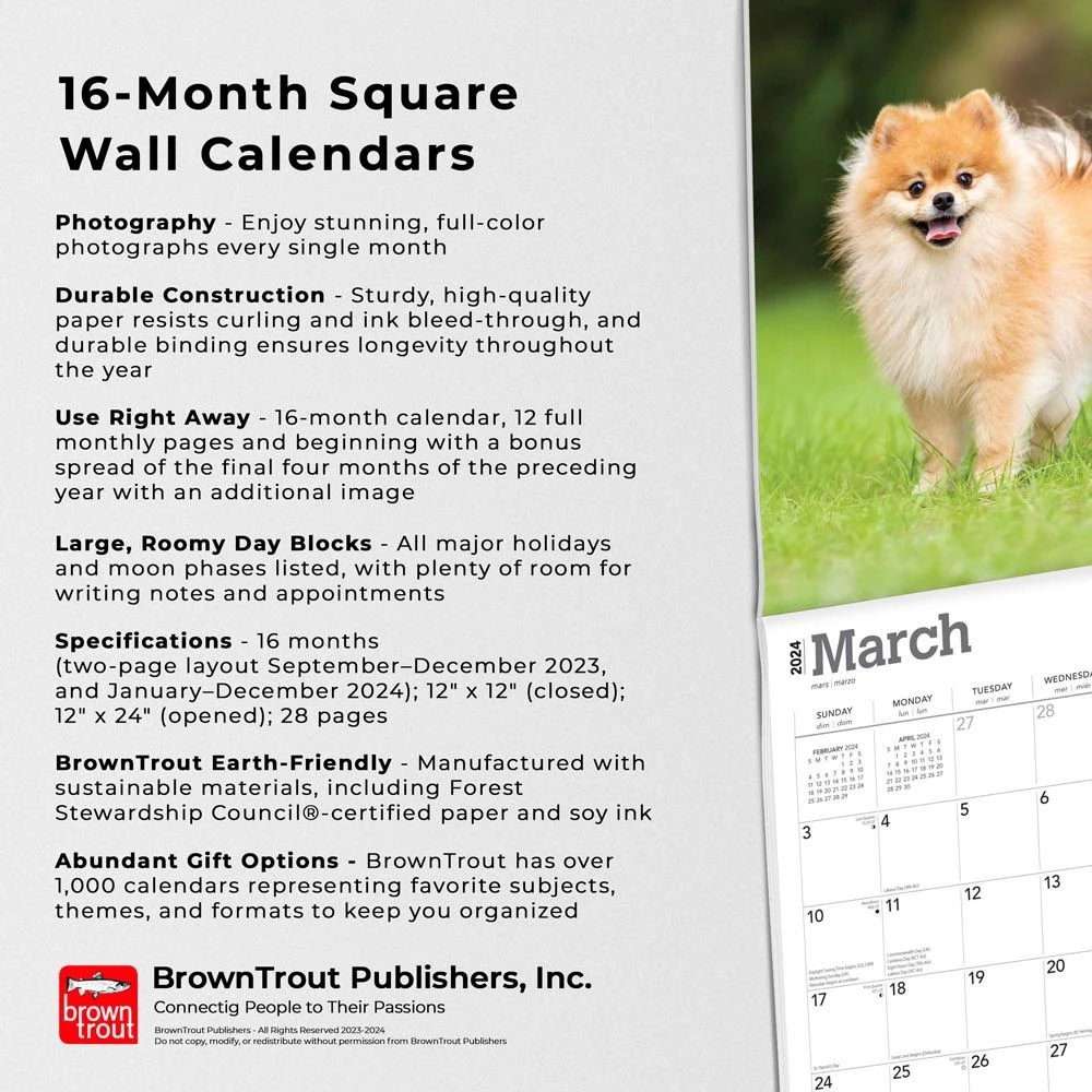 Though they weigh a mere three to seven pounds, Pomeranians are fearless watchdogs. Perky, curious, and brave, they are loving companions, and they certainly do not shun a little pampering. Poms are bred in a manner that creates two distinctive facial looks: fox faced and baby faced. This calendar shows both faces of these adorable dogs.