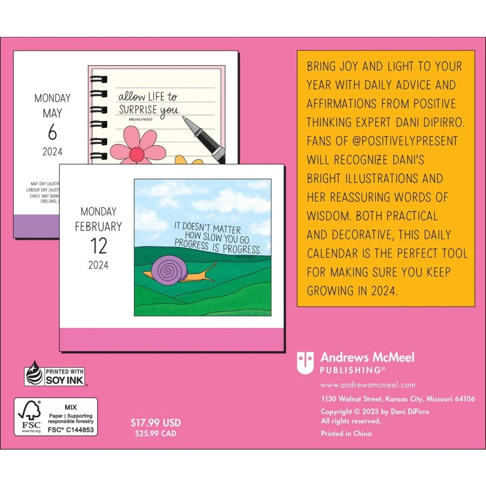 Sometimes it can be a real challenge to stay positive and focus on personal growth throughout the year ? especially when life throws a million curveballs at us. That’s why we’ve created the Positively Present 2024 Day to Day Calendar: Keep Growing Through It! Have fun seeing Dani DiPirro’s vibrant illustrations of the four seasons as you turn each page, and appreciate the daily reminders to keep growing, love yourself, and believe in your potential. This 5.25″ x 4.375″ desk calendar provides plenty of space for jotting down notes or shopping lists too. You can display it anywhere with its easel backer, and easily tear off pages to take them with you if needed. Plus, all pages are printed on FSC certified paper using soy based ink ? so you can know that ensuring your self care is also good for our planet! Not to mention it includes official major world holidays and observances too ? making sure every day has something to look forward to! Start your journey of self discovery with Positively Present 2024 Day to Day Calendar: Keep Growing Through It today!