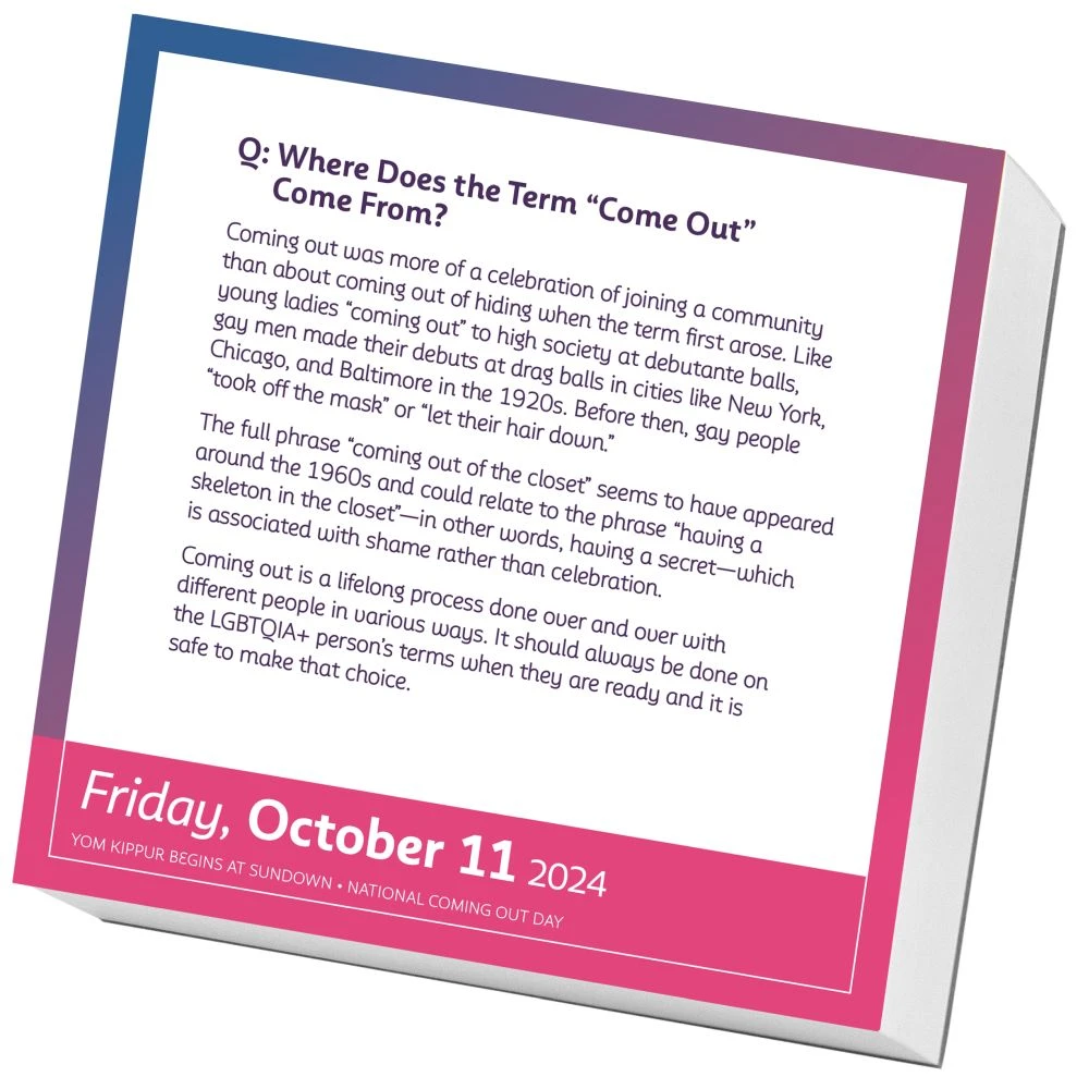 Celebrate Pride every day! Written by Sarah Prager?author, speaker, and creator of the app Quist, who has dedicated her life to raising awareness of LGBTQIA+ history?this calendar is a fascinating mix of facts, profiles, milestones, quizzes, vocabulary, and more. Meet trailblazing people like the Reverend Dr. Ellen Barrett, an outspoken gay and lesbian rights advocate and the first out lesbian to be ordained as an Episcopal priest in 1977. Landmark places to add to your itinerary, like New York City?s vibrant Greenwich Village. And inspiring quotes: ?Being gay has taught me tolerance, compassion, and humility. It has shown me limitless possibilities of living.??writer Armistead Maupin. Printed on responsibly sourced paper and 100% recyclable.