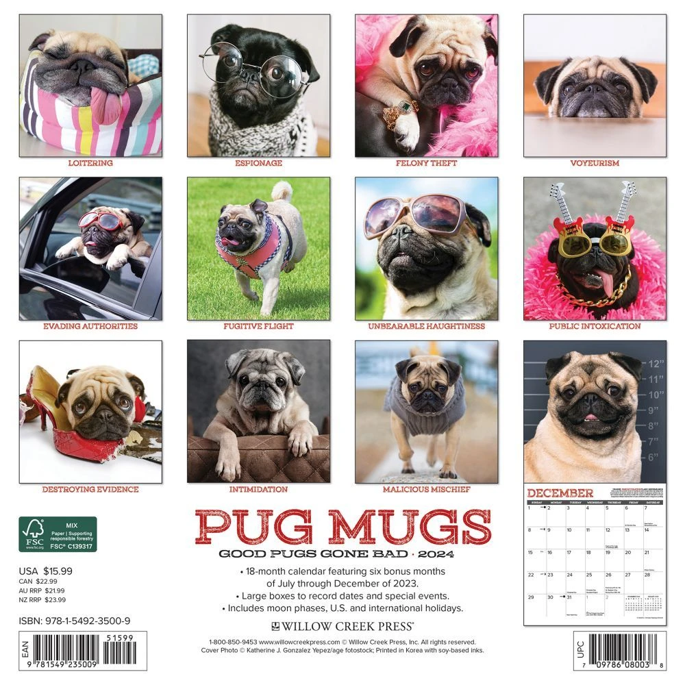 Hidden beneath the big eyes and innocent face often lurks a Pug who has waddled to the wrong side of the tracks! The twelve mug shots in this hilarious full color calendar include rap sheets featuring petty theft, bribery fraud and vandalism. Printed with soy based inks on FSC certified paper, this 12″ x 24″ wall calendar features large monthly grids that offer ample room for jotting notes, along with six bonus months of July through December of 2023. Also includes moon phases (CST), standard U.S. and international holidays.