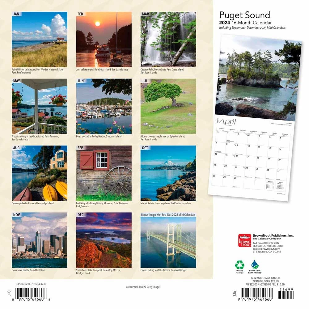 The majesty and grandeur of the beautiful, tranquil expanse of water leading from northwest Washington to the Pacific Ocean is captured in this wall calendar. From the Olympic Peninsula to the west, to the sophisticated city of Seattle hugging its eastern shore, and the many islands and peninsulas in between, the serenity of Puget Sound can be yours up close all year in this beautiful calendar.