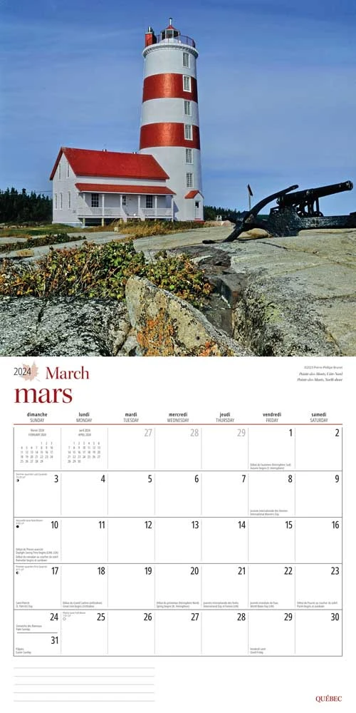Quebec is chock-full of historical places, beautiful little towns, pastoral farmlands and the untamed Canadian Shield. Enjoy the province’s scenery from the Atlantic all the way down the St. Lawrence River to Montreal, from the woodland rivers to the snow-capped mountains. This square wall calendar is bilingual (English, French).