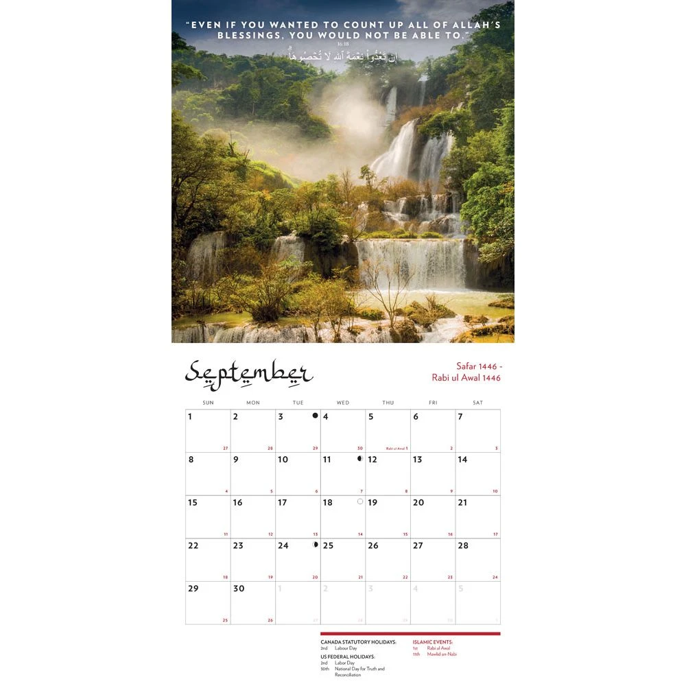 Explore and understand Quran Inspiration. Today, the Quran serves as the foundation of Islamic theology, and is revered by Muslims all over the world as a source of inspiration for everything from understanding God, learning about the Prophets and how to live a life of good deeds. No matter what a Muslim is facing in life, he/she can easily turn towards the Quran to find inspiration and motivation. Each and every letter, word, and verse of the Holy Quran contain a beautiful message or lesson for us from Allah (SWT). This 2024 calendar features 12 wonderful images and verses, as well as a useful Hijri calendar and key Islamic holidays. The calendar is designed so that it can be hung on a wall. Each week of the calendar begins on a Sunday and it includes an extra four month planner for September 2023 to December 2023. This calendar is free of plastic packaging.