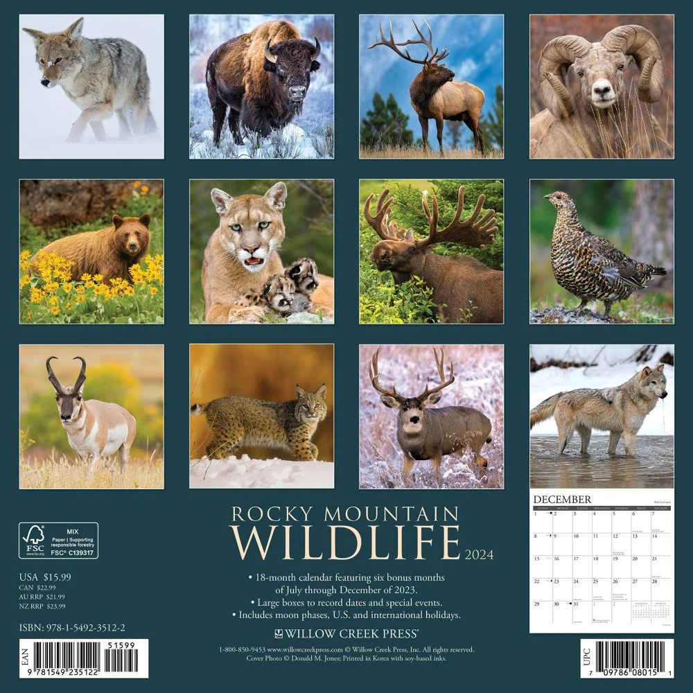 Bighorn sheep sit together on the alpine tundra while a bull elk stands down below, it’s breath visible, as it bugles across the fall colored field. A black bear pads along a creekbed looking for cutthroat trout and roaming buffalo cross highways wherever they see fit. Printed with soy based inks on FSC certified paper, this 12″ x 24″ wall calendar features large monthly grids that offer ample room for jotting notes, along with six bonus months of July through December of 2023. Also includes moon phases (CST), standard U.S. and international holidays.