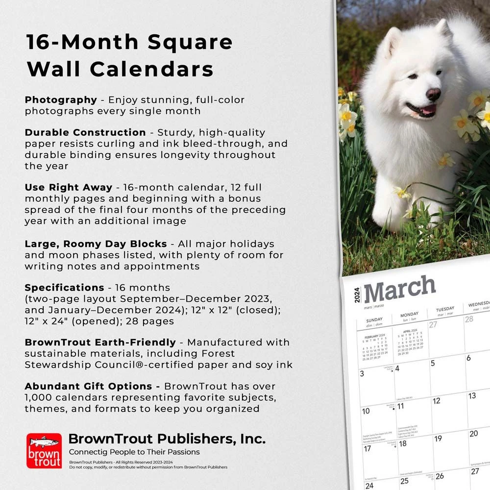 The Samoyed is a fun loving, happy dog that always seems to have a smile on its face. Although its ancestry is unclear, the Samoyed derives its name from the Samoyed people of the Siberian tundra. Sammies love cold weather and enjoy playing in the snow. This delightful calendar celebrates the fluffy and friendly Samoyed.