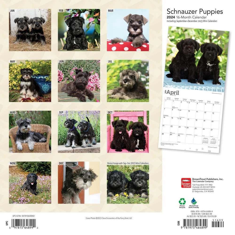 These cute little puppies are very active and require lots of attention. They are affectionate and relish the company of people. They will grow up to be sturdy dogs and they will make friendly, reliable companions. This charming calendar features an especially sweet bunch of Schnauzer puppies.