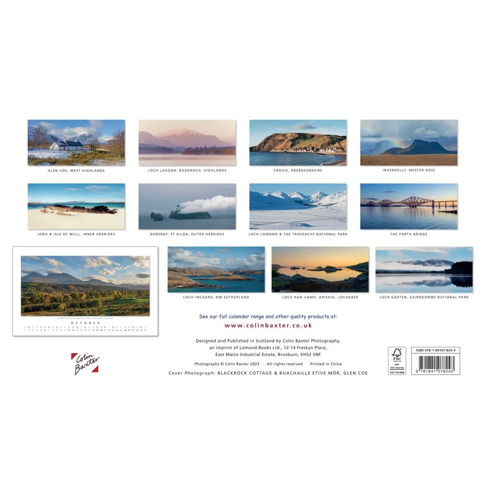 2024 calendar featuring Colin Baxter photographs. This is a wire o style calendar it has 12 pages plus cover, backing board and stiffener. Wire bound and individually shrink wrapped. Calendar dimensions: 215 x 305mm (430 x 305 mm when opened). Images included are: Glen Coe, West Highlands; Loch Laggan, Badenoch, Highlands; Crovie, Aberdeenshire; Inverpolly, Wester Ross; Iona and Isle of Mull, Inner Hebrides; Boreray, St Kilda, Outer Hebrides; Loch Lomond & the Trossachs National Park; The Forth Bridge; Loch Inchard, Sutherland; Loch Nam Uamh, Arisaig, Lochaber; Loch Garten, Cairngorms National Park; Ben Nevis, The Great Glen, Highlands.