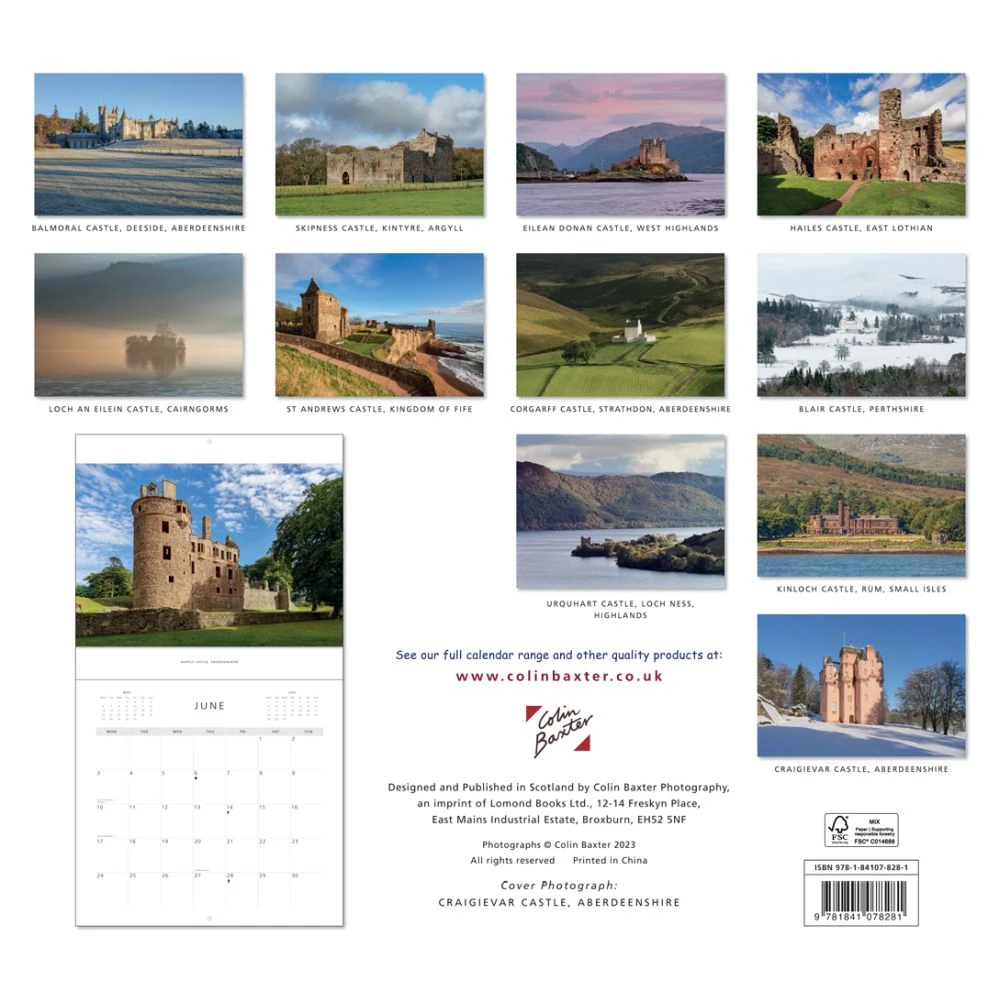 2024 calendar featuring Colin Baxter photographs. This is an engagement style calendar opens to double size with date spaces on the lower page for note taking. Calendar has 24 pages and is shrink wrapped with a card stiffener. Calendar dimensions: 280 x 305mm (560 x 305 mm when opened). Images included are: Balmoral Castle, Aberdeenshire; Skipness Castle, Argyll; Eilean Donan Castle, West Highlands; Hailes Castle, East Lothian; Loch an Eilein Castle, Cairngorms; St Andrews Castle, Fife; Corgarff Castle, Strathdon; Blair Castle, Perthshire; Huntly Castle, Aberdeenshire; Urquhart Castle, Loch Ness; Kinloch Castle, Rum; Craigievar Castle, Aberdeenshire.