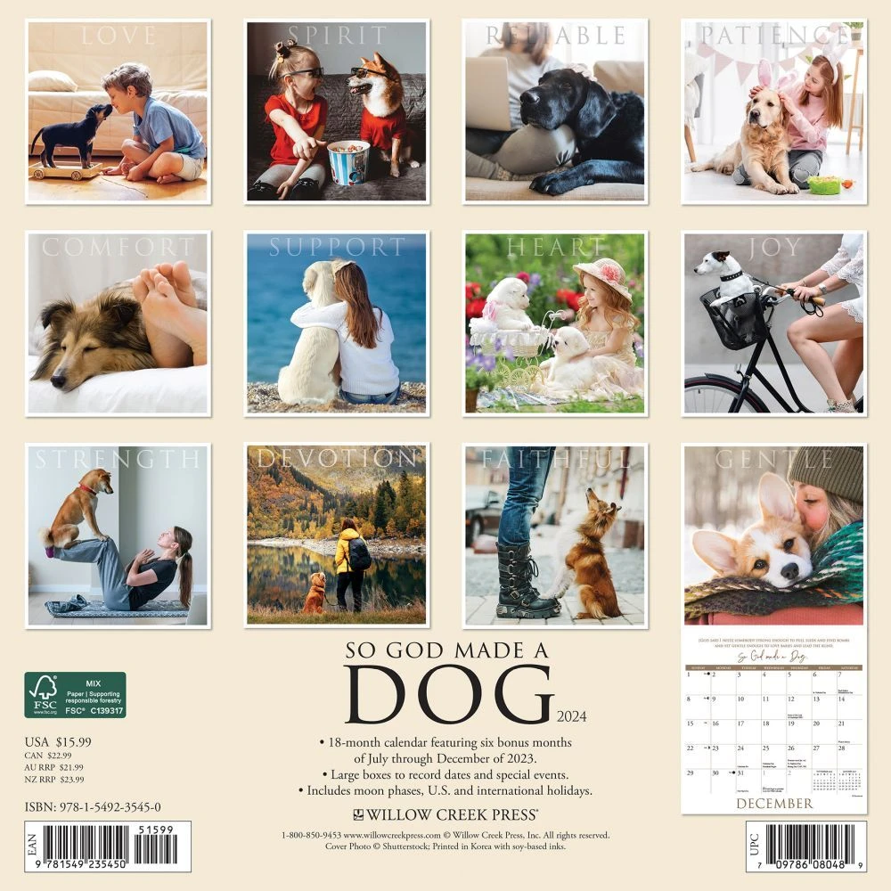 And on the 9th day God looked down on his wide eyed children and said, they need a companion. So God made a Dog. This charming ode to the endearing attributes of man’s best friend will brighten your days and remind you to truly appreciate the gift that waits at home with soft eyes and a wagging tail. Printed with soy based inks on FSC certified paper, this 12″ x 24″ wall calendar features large monthly grids that offer ample room for jotting notes, along with six bonus months of July through December of 2023. Also includes moon phases (CST), standard U.S. and international holidays.
