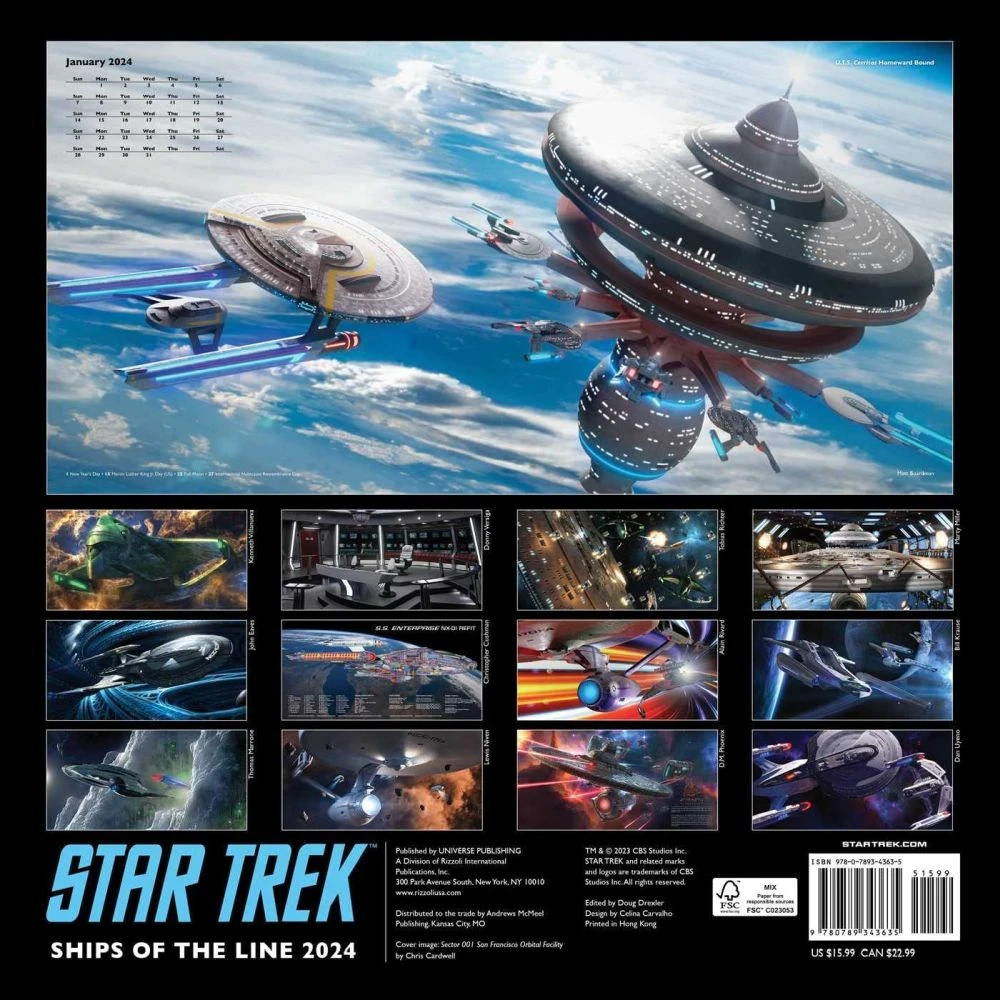 Star Trek: Ships of The Line 2024 Wall Calendar HORIZONTALLY formatted calendar is dedicated to showcasing spectacular images of the most famous vessels from the iconic franchise in a variety of iconic scenes and settings.