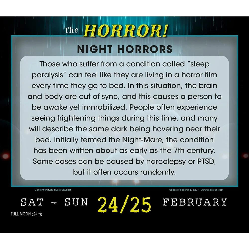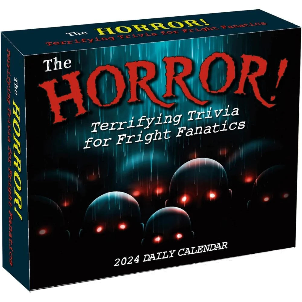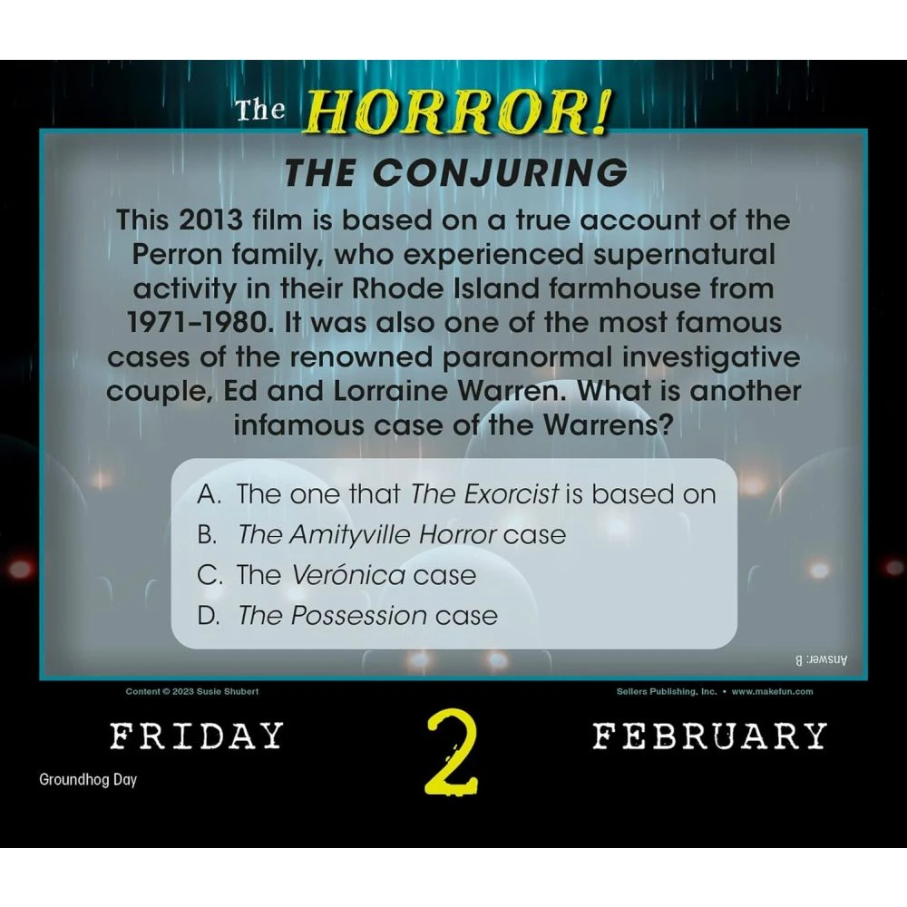 We all like a good scare.The Horror! Terrifying Trivia for Fright Fanatics is a fun daily trivia calendar that draws from best selling books to blockbuster films to horror history, to delight and challenge horror junkies and fanatics. With topics ranging from Horror History, Villains of Horror, Creature Feature, From Scream to Screen, and Blockbuster Madness, each day offers something creepy or scary to test your knowledge.