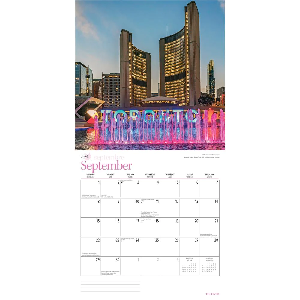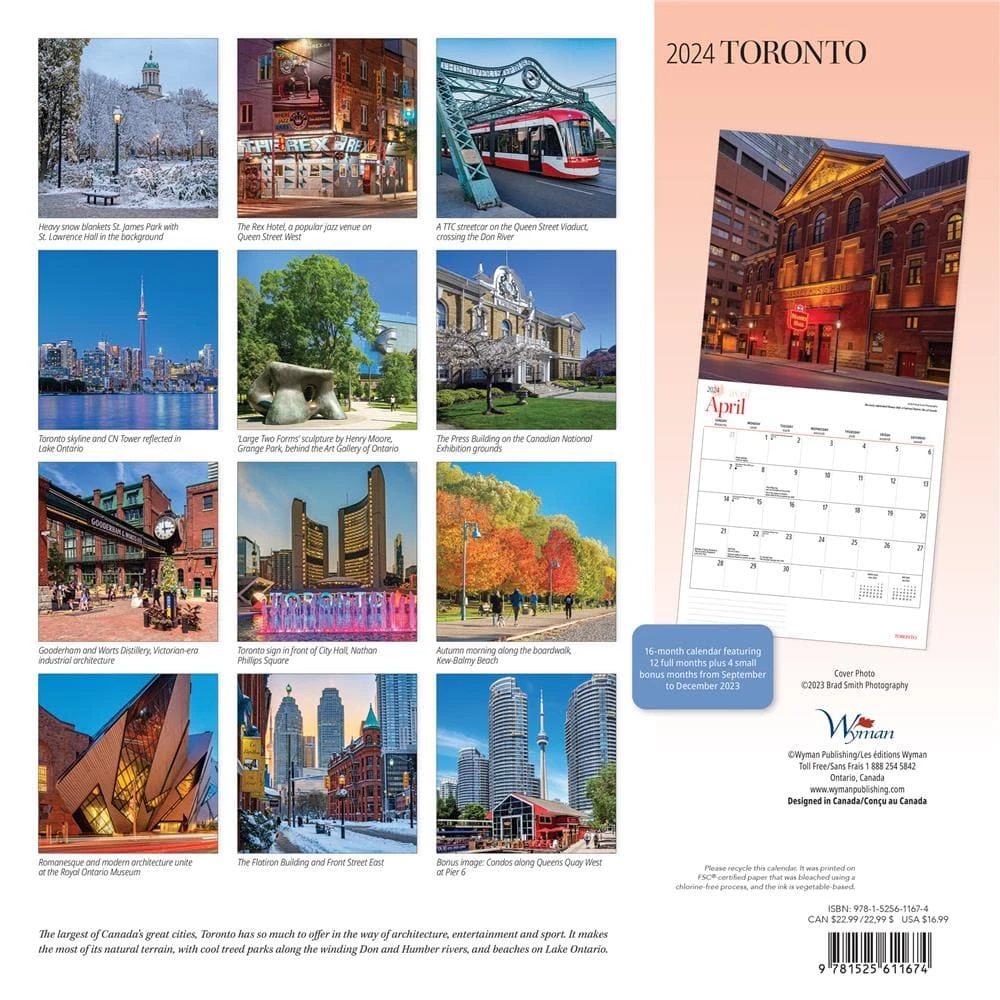 The largest of Canada’s great cities, Toronto has so much to offer in the way of architecture, entertainment and sport. It makes the most of its natural terrain, with cool treed parks along the winding Don and Humber rivers, and beaches on Lake Ontario. This square wall calendar is produced in English.
