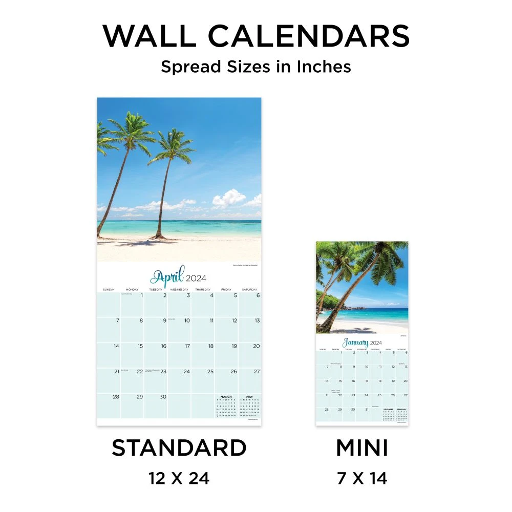 Which way to the beach? Inspiring “happy places” in many imaginations, these sandy beaches with billowing palm trees and crystal clear waters will help you get away from the daily grind and inspire you to plan your next vacation. Our 2024 12 month Tropical Beaches wall calendar measures 12″ x 12″ and includes thirteen stunning full color images combined with monthly calendar grids and a bonus 4 month view of January 2025 April 2025. Printed on premium gloss paper.