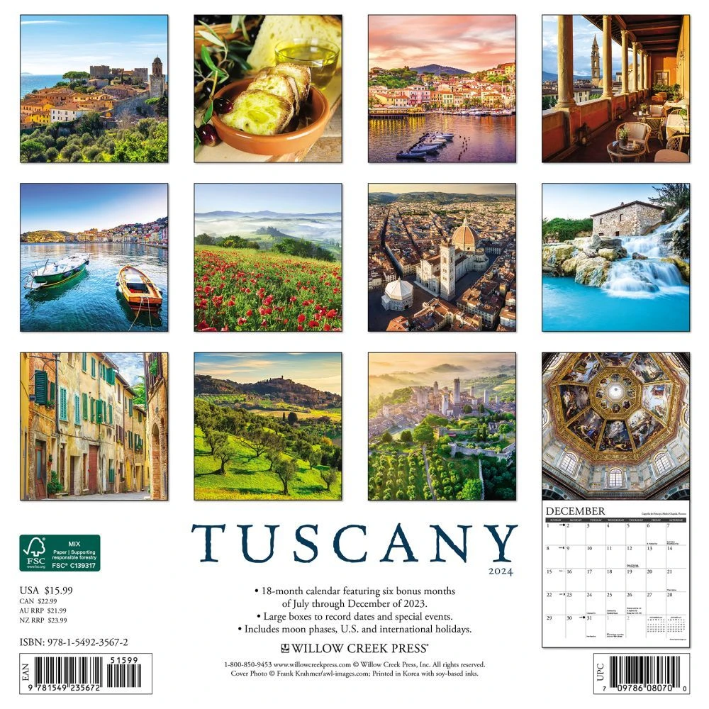 These twelve luscious photographs evoke the sunlit charm and rolling hills of the old world Tuscan countryside. If you’ve not been there, this calendar will inspire you to go; and if you have been there, it calls for your return. Printed with soy based inks on FSC certified paper, this 12″ x 12″ wall calendar features large monthly grids that offer ample room for jotting notes, along with six bonus months of July through December of 2023. Also includes moon phases (CST), standard U.S. and international holidays.