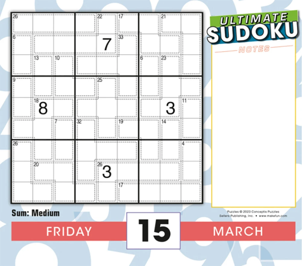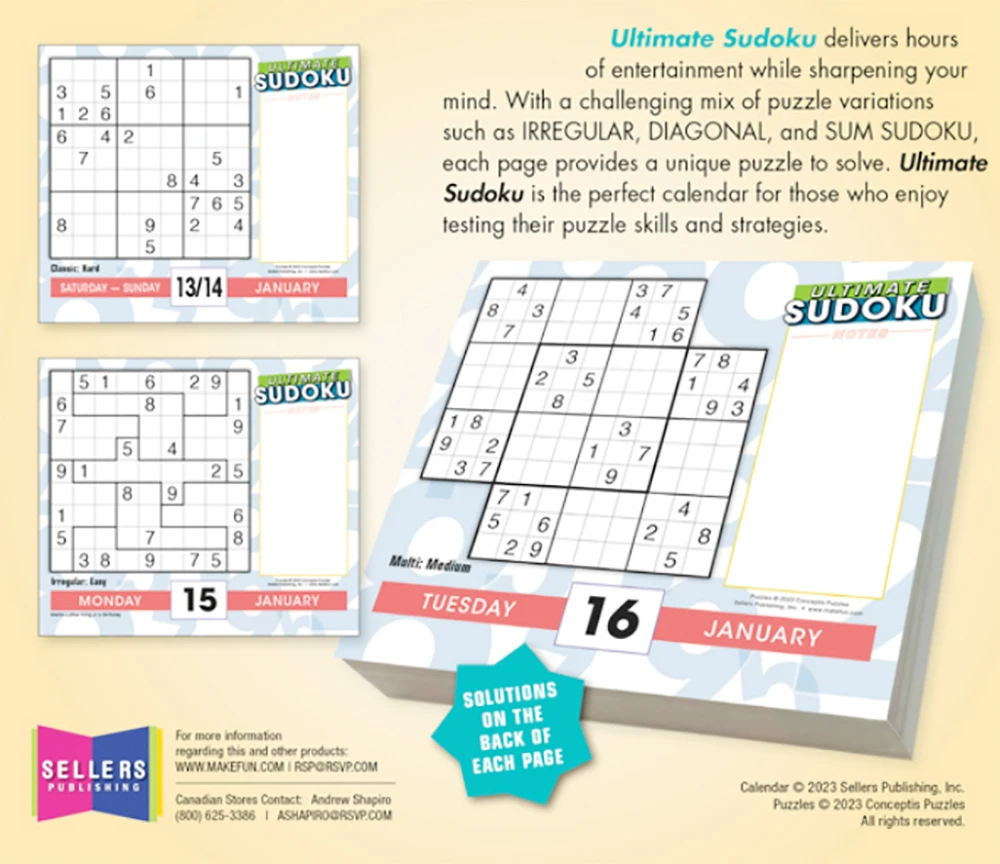 Ultimate Sudoku daily calendar provides hours of entertainment while sharpening your mind. With a mix of puzzle variations to challenge all levels, such as IRREGULAR, DIAGONAL, and SUM SUDOKU, each page provides a unique puzzle to solve. Ultimate Sudoku is the perfect calendar for those who enjoy testing their puzzle skills and strategies.