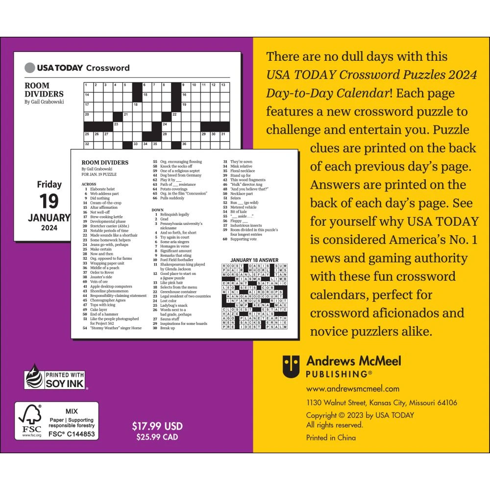 See why USA TODAY is considered America’s No. 1 news?and gaming?authority and join the legions of brainiacs who solve USA TODAY’s crossword puzzles every day with this daily calendar. Each page features a new crossword puzzle, with the answers printed on the back.Features include:? 5.25 x 4.375″ page size? Easel backer for desk or tabletop display? Printed on FSC certified paper with soy based ink? Full color tear off pages? Answers on the back of each page? Day/Date reference on each page? Combined weekend pages? Official major world holidays and observances? Contains daily crossword puzzles designed to challenge and entertain