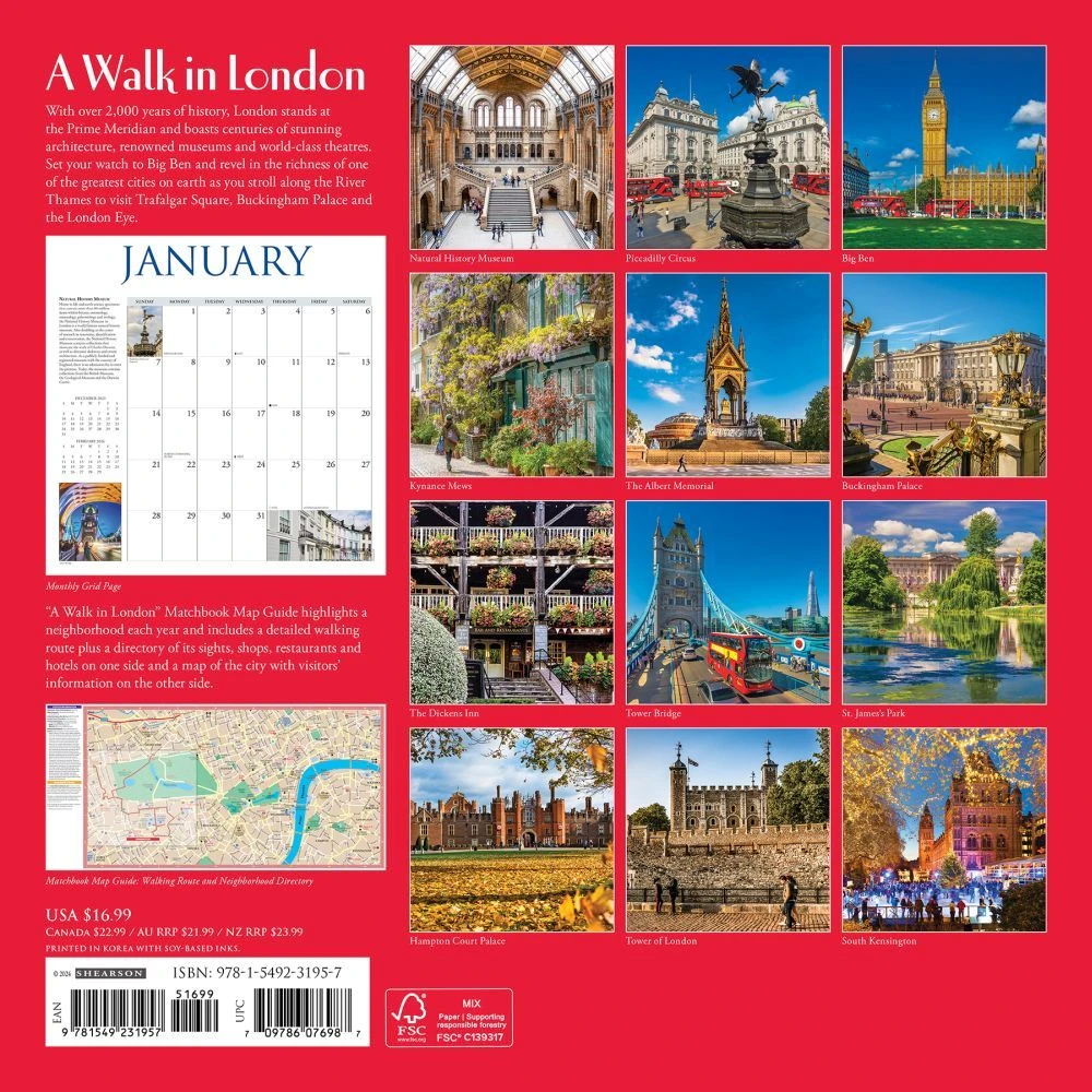 With over 2,000 years of history, London stands at the Prime Meridian and boasts centuries of stunning architecture, renowned museums and world class theatres. Set your watch to Big Ben and revel in the richness of one of the greatest cities on earth as you stroll along the River Thames to visit Trafalgar Square, Buckingham Palace and the London Eye. The included pocket sized map features a detailed walking route of a popular neighborhood along with a directory of its sights, shops, restaurants and hotels. Printed with soy based inks on FSC certified paper, this 12”x 24” wall calendar features 12 large monthly grids that offer ample room for jotting notes, along with moon phases (CST), and standard U.S. and international holidays.