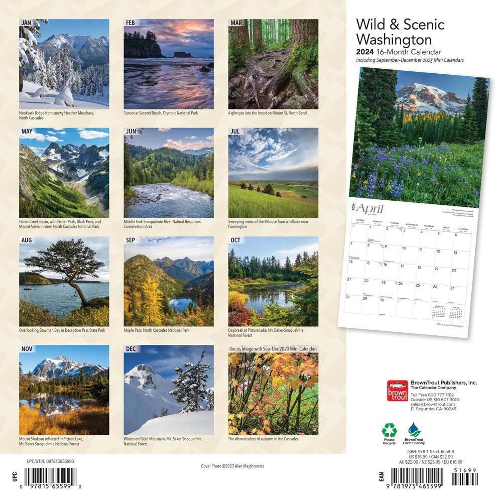 Pristine and picturesque Washington is a land of great beauty. Magnificent old growth forests, the stunning Cascade Mountains, Olympic National Park, and the San Juan Islands combine to form a diverse and truly unique collection of natural landscapes. Let this Wild & Scenic Washington calendar take you on a spectacular tour through the Evergreen State.