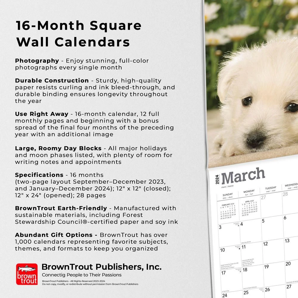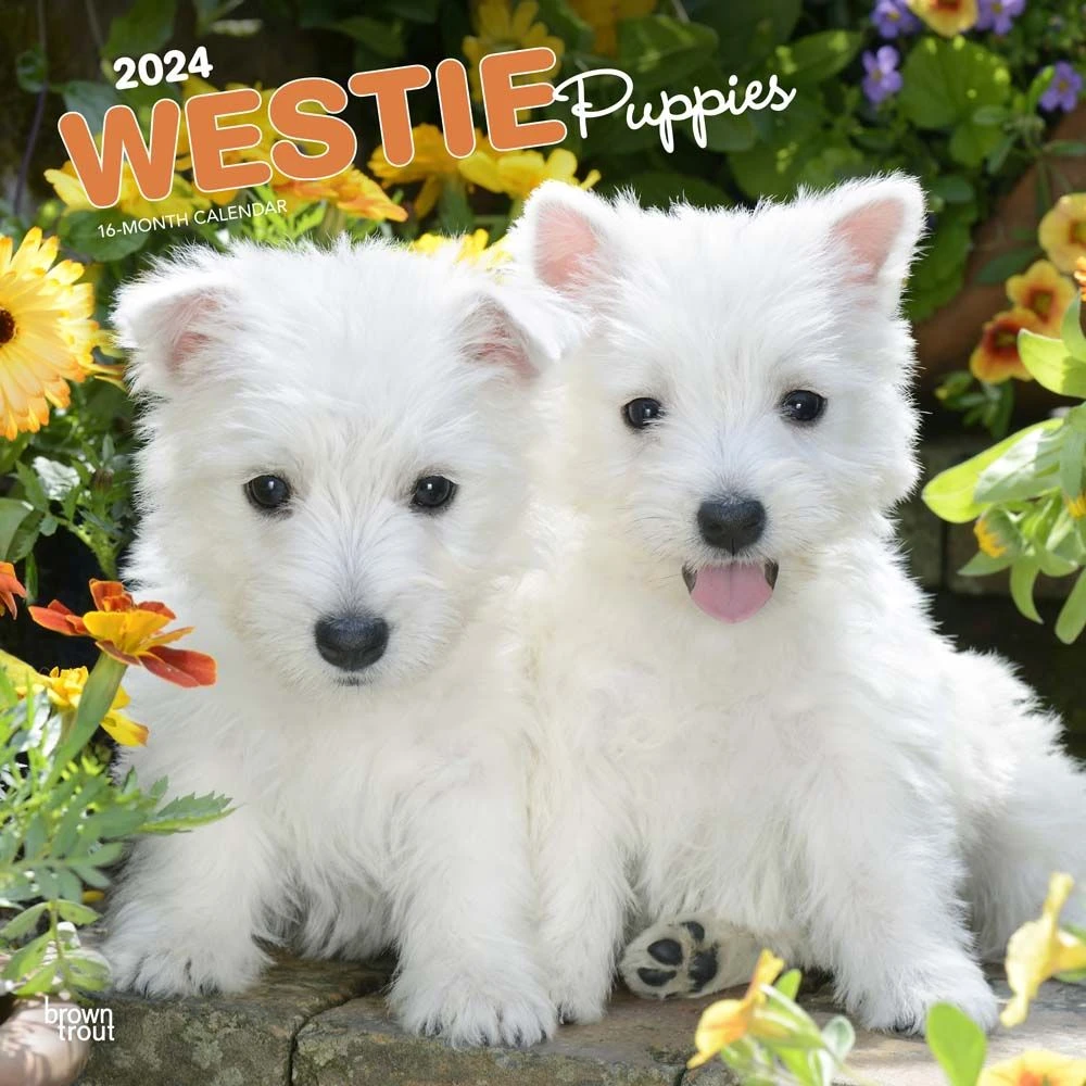 Westie puppies are smart, spirited little dogs. These angelic pups will grow up to be sweet and sturdy companions. As puppies and well after they’ve fully matured these playful and affectionate terriers will provide endless amounts of fun to their fortunate families. Enjoy adorable photographs of Westie puppies in this charming calendar.