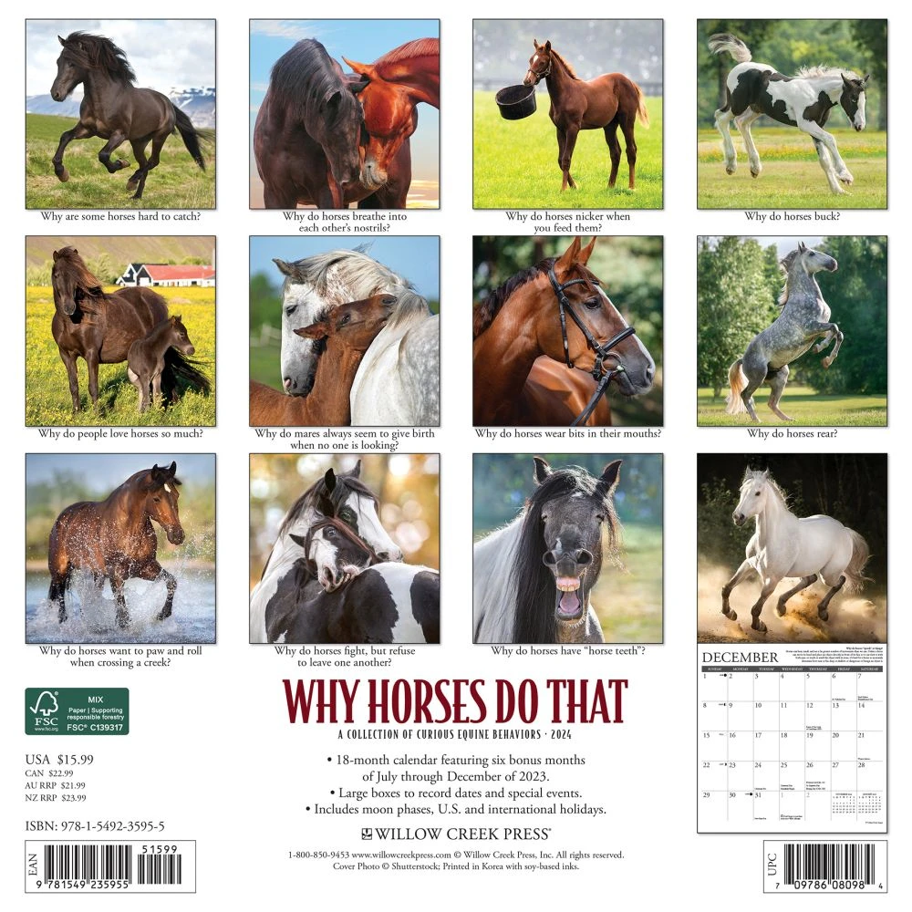 Twelve curious equine behaviors illustrated with bright, full color photographs and explained in descriptive text. Printed with soy based inks on FSC certified paper, this 12″ x 24″ wall calendar features large monthly grids that offer ample room for jotting notes, along with six bonus months of July through December of 2023. Also includes moon phases (CST), standard U.S. and international holidays.