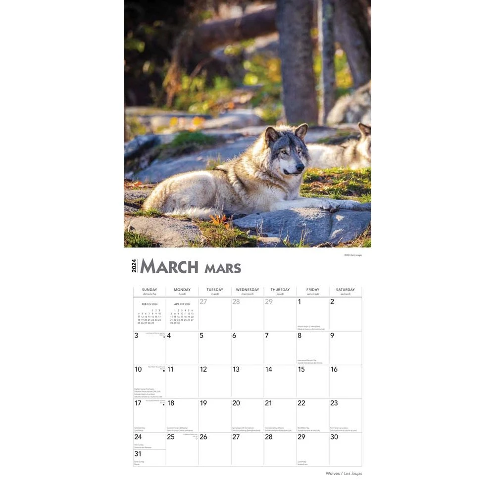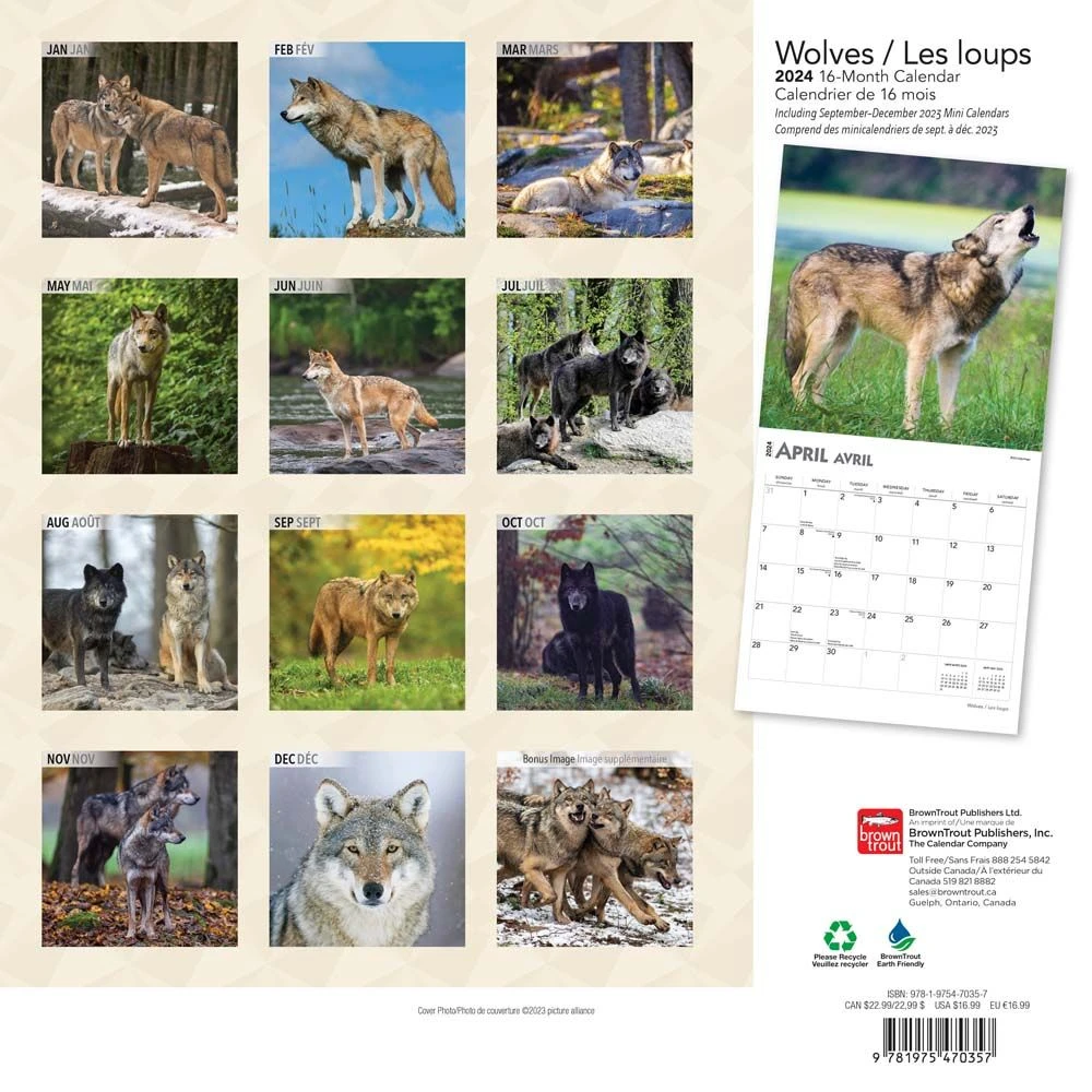 A not so distant, yet utterly wild relative of man’s best friend, the wolf is an intelligent and social animal that usually lives in packs. Long ago, different species of these powerful carnivores lived throughout much of North America and the world. Celebrate these amazing creatures as they play, hunt, and howl throughout this wonderful bilingual (English/French) calendar.