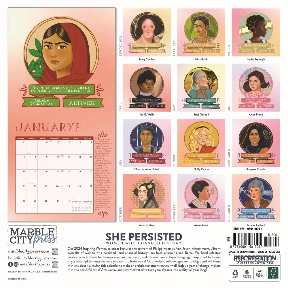 Our 2024 Inspiring Women calendar features the artwork of Philippine artist Ann Joven, whose warm, vibrant portraits of women who persisted�and changed history�are both charming and fierce. We hand selected quotes by each character to inspire and motivate you, and informative captions to highlight important facts and major accomplishments�in case you want to learn more! Our modern, subdued gradient background will blend with any decor, allowing this calendar to make an artistic statement on your wall. Enjoy a year of change makers with the beautiful art of Ann Joven, and stay motivated to turn your dreams into reality, all year long!